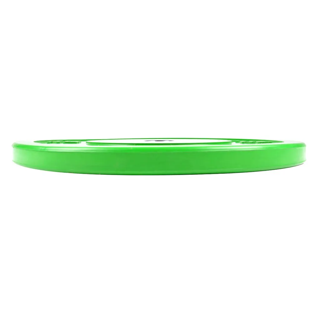 Dimensions : 31x31x4.4cmweight : 10.00kgcolor : greenmaterial : rubbertraining : the olympic ”competition” 51mm bore rubber coated discs are equipped with a 51mm thick metal bore for a good fit and ease of sliding the disc into the bar.