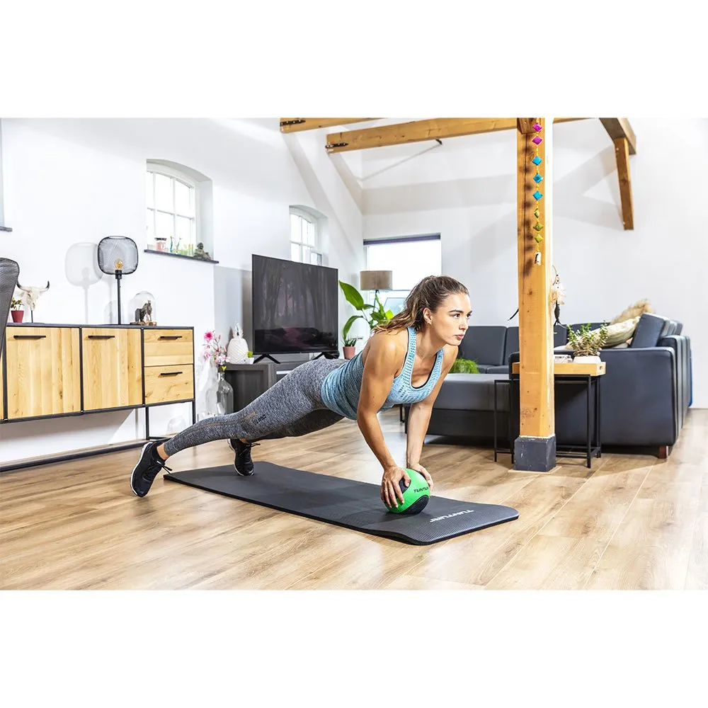 You can use the ball to intensify already known exercises by adding extra weight, for example by taking the ball in your hands during a normal crunch or by placing it under the arm during push-ups.